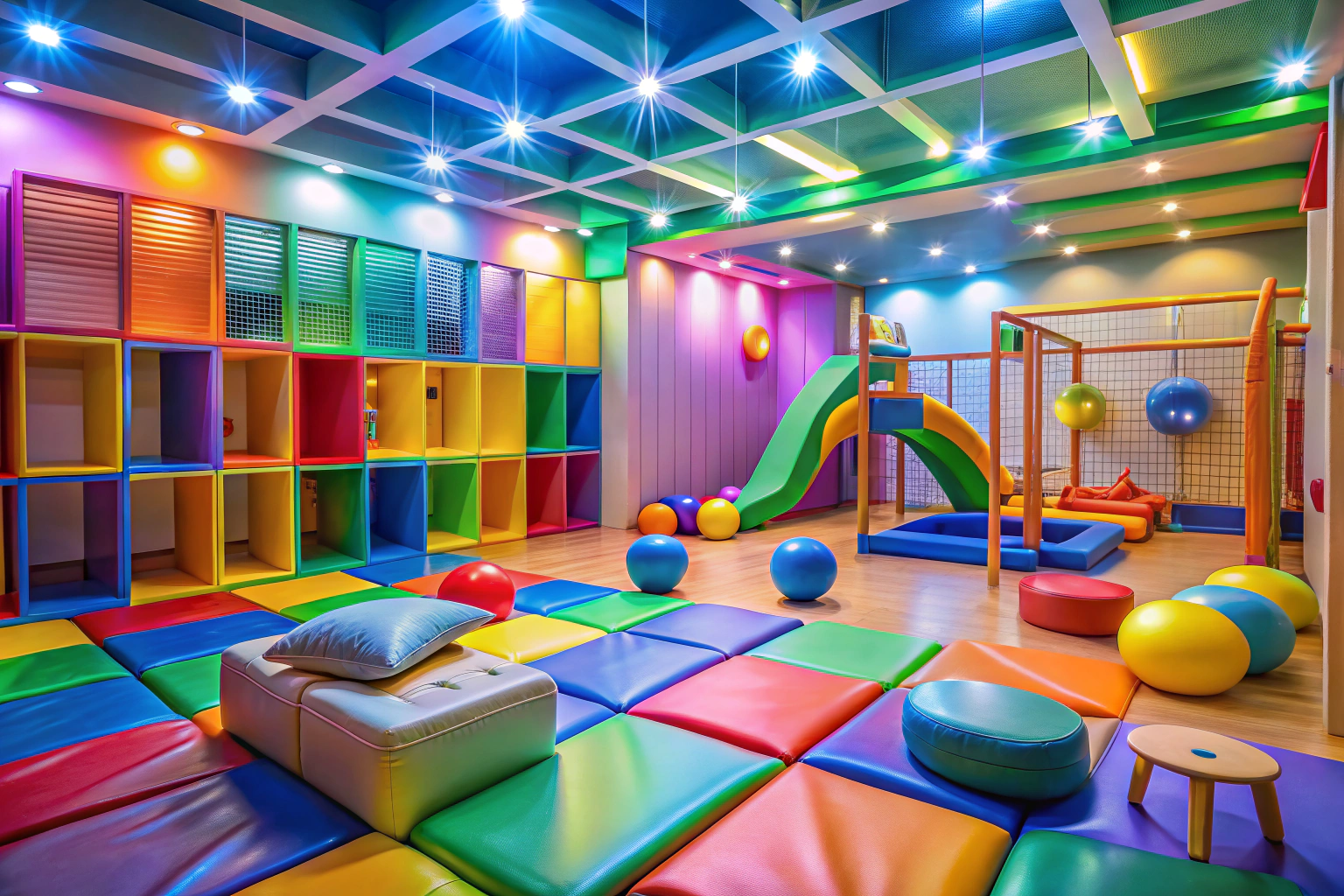 Egy tágas, világos játékterem belső tere, színes játékberendezésekkel, puha matracokkal és természetes fénnyel, teljesen mentes feliratoktól vagy jelképektől